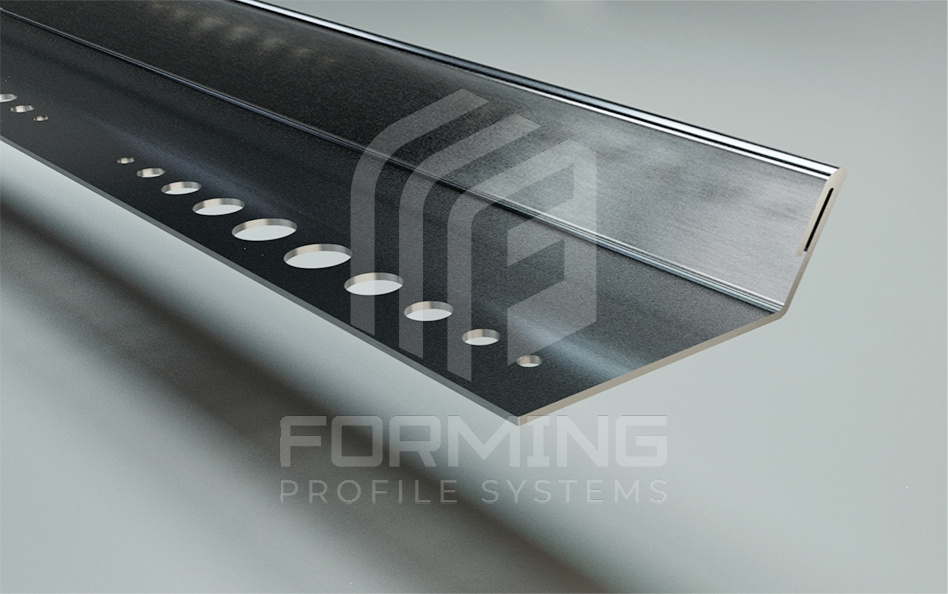 Профиль C-образный, торцевой с углом наклона 450 для кафельной плитки из нержавеющей стали 0,8 мм в стандартном исполнении. Используется, как декоративный, закладной элемент при формировании завершения или начала раскладки для кафельной плитки, керамогранита, стеновых панелей, закладной элемент напольных, стеновых или потолочных покрытий.