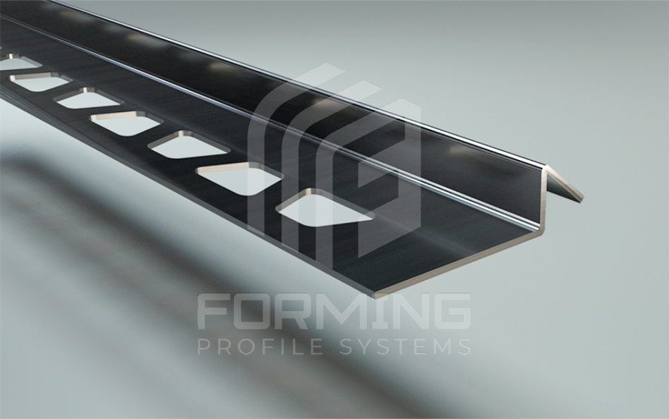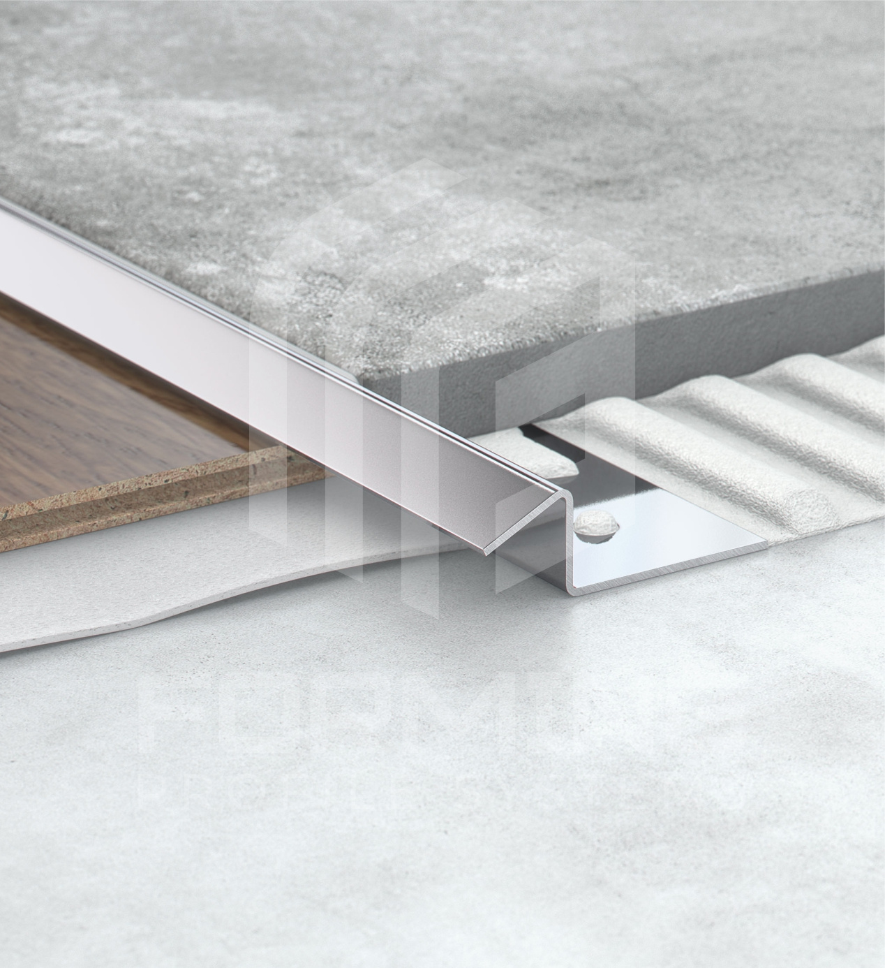 Разноуровневый профиль для кафельной плитки из нержавеющей стали 0,8 мм в стандартном исполнении. Используется, как декоративный, закладной элемент при формировании завершения или начала раскладки для кафельной плитки, керамогранита, стеновых панелей, закладной элемент напольных, стеновых или потолочных покрытий.