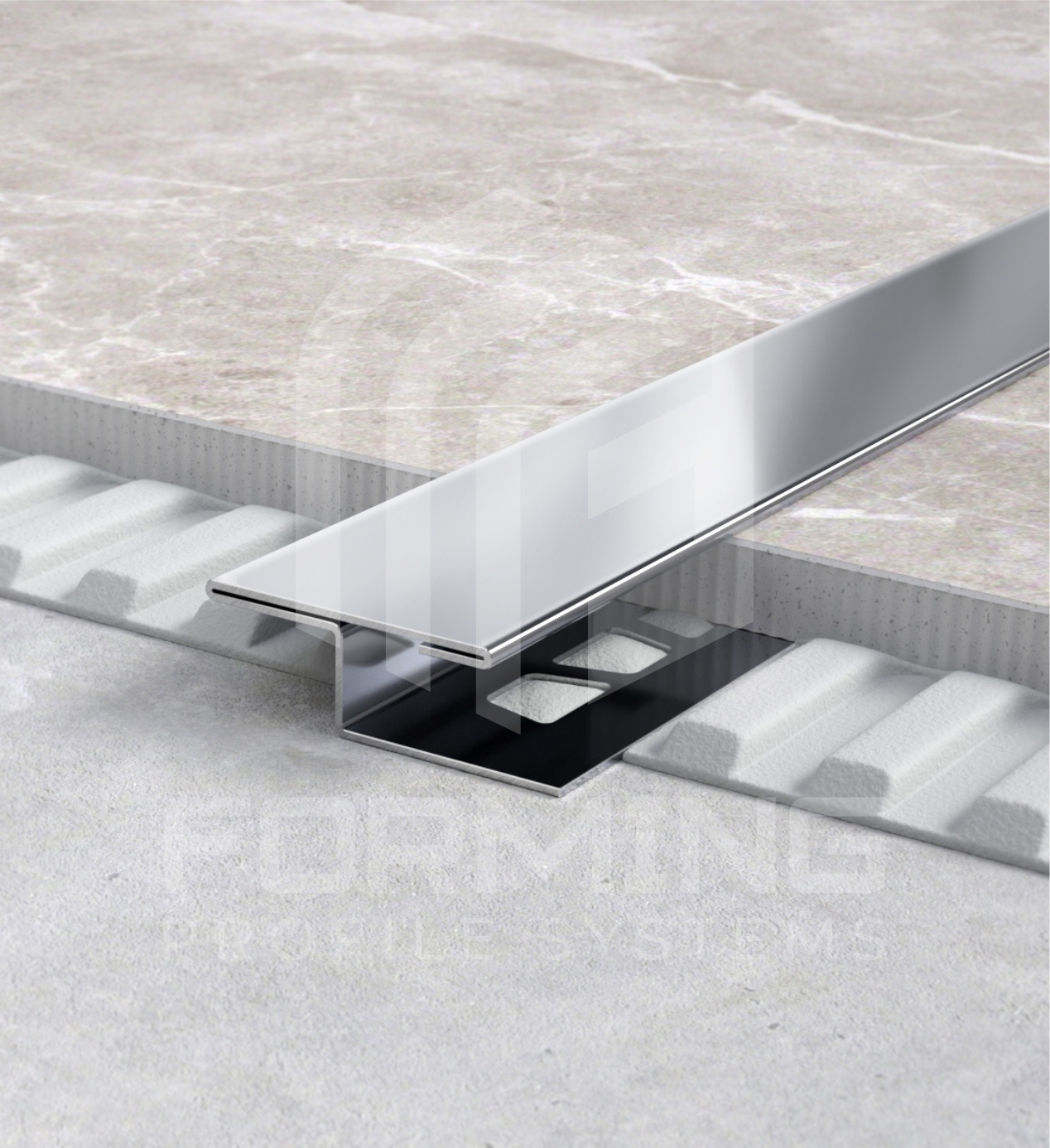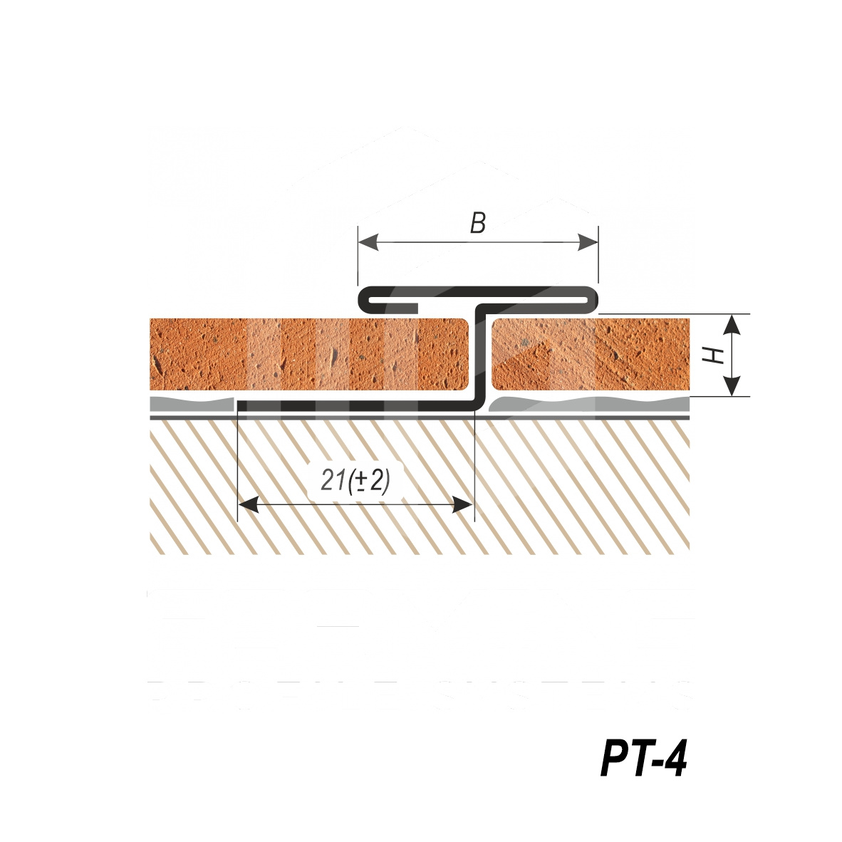 Т – образный профиль с фиксацией под покрытие из нержавеющей стали 0,8 мм в стандартном исполнении. Профиль используется, как декоративная вставка между различными материалами, является частью композиции пола, стен, мебели. Выполняет функцию перекрытия чернового зазора между материалами, визуально разделяет элементы архитектуры.
