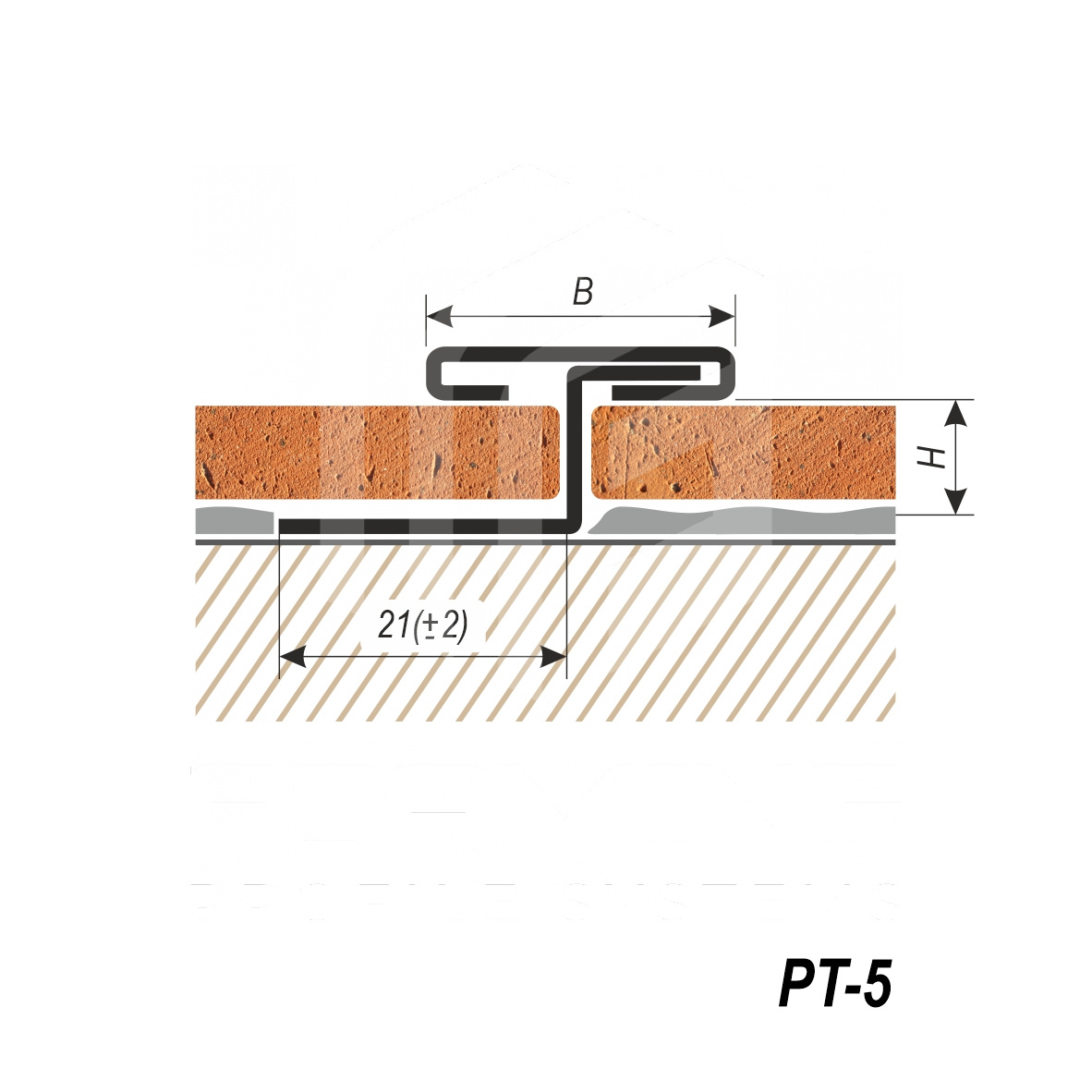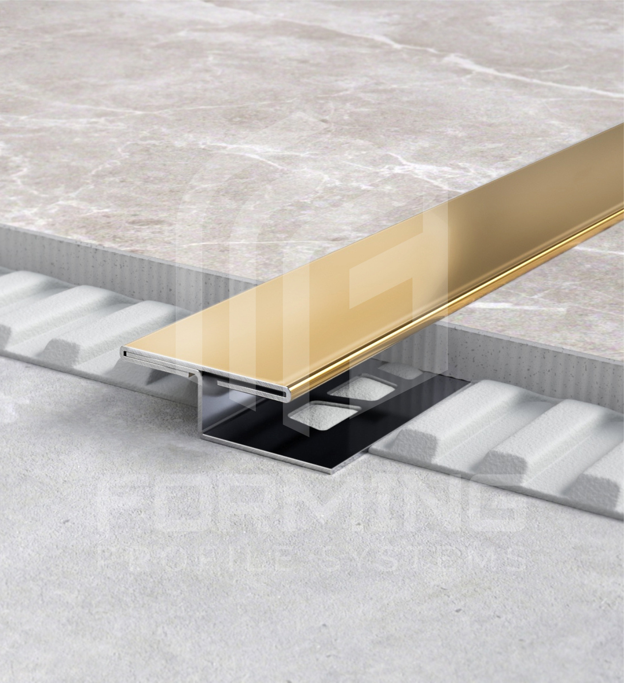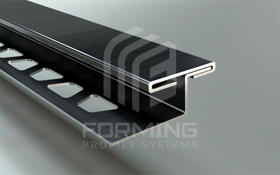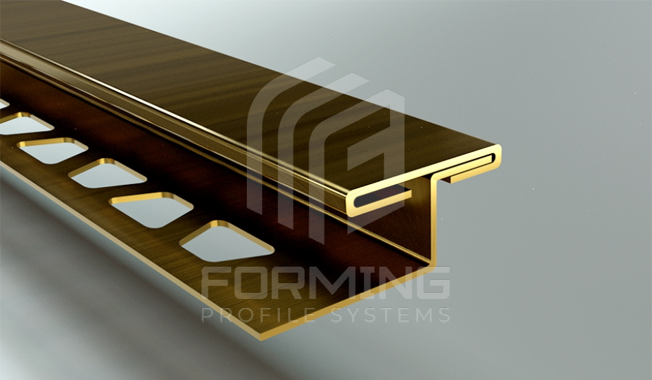 Т – образный профиль с фиксацией под покрытие из нержавеющей стали 0,8 мм в стандартном исполнении. Профиль используется, как декоративная вставка между различными материалами, является частью композиции пола, стен, мебели. Выполняет функцию перекрытия чернового зазора между материалами, визуально разделяет элементы архитектуры.