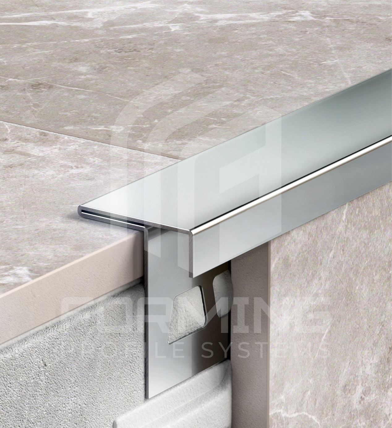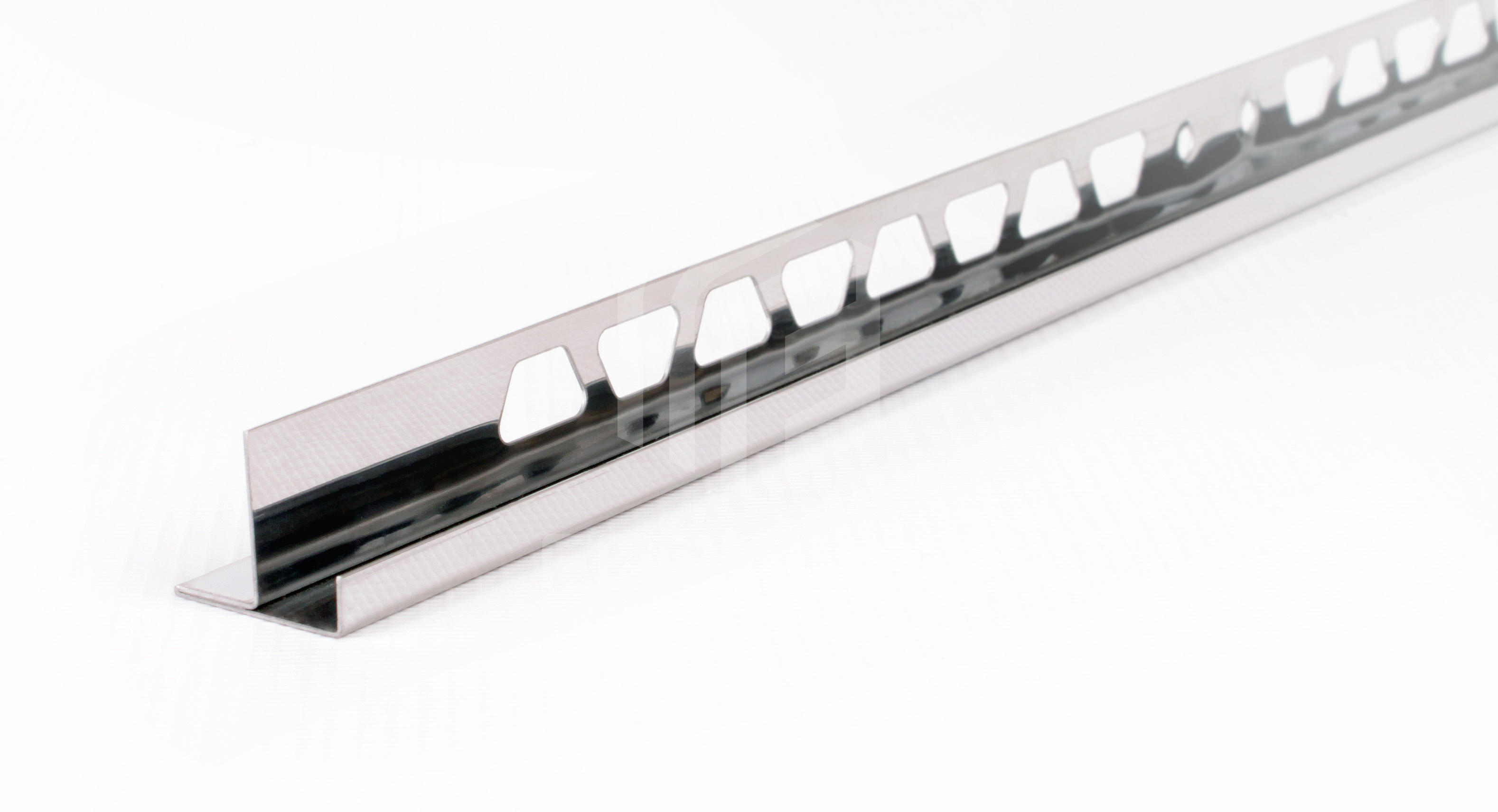 Угловой профиль из нержавеющей стали 0,8 мм в стандартном исполнении c закладной частью под плитку или керамогранит, для защиты угла ступеней.
