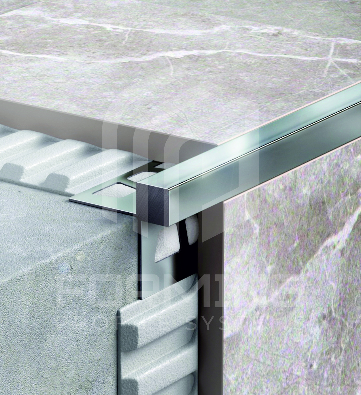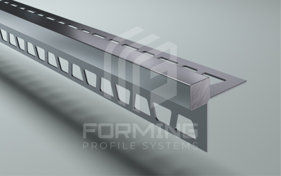 Цельнометаллический сварной профиль из нержавеющей стали 0,8 мм в стандартном исполнении c закладными частями под плитку или керамогранит, для защиты угла ступеней.