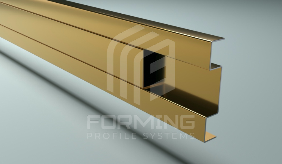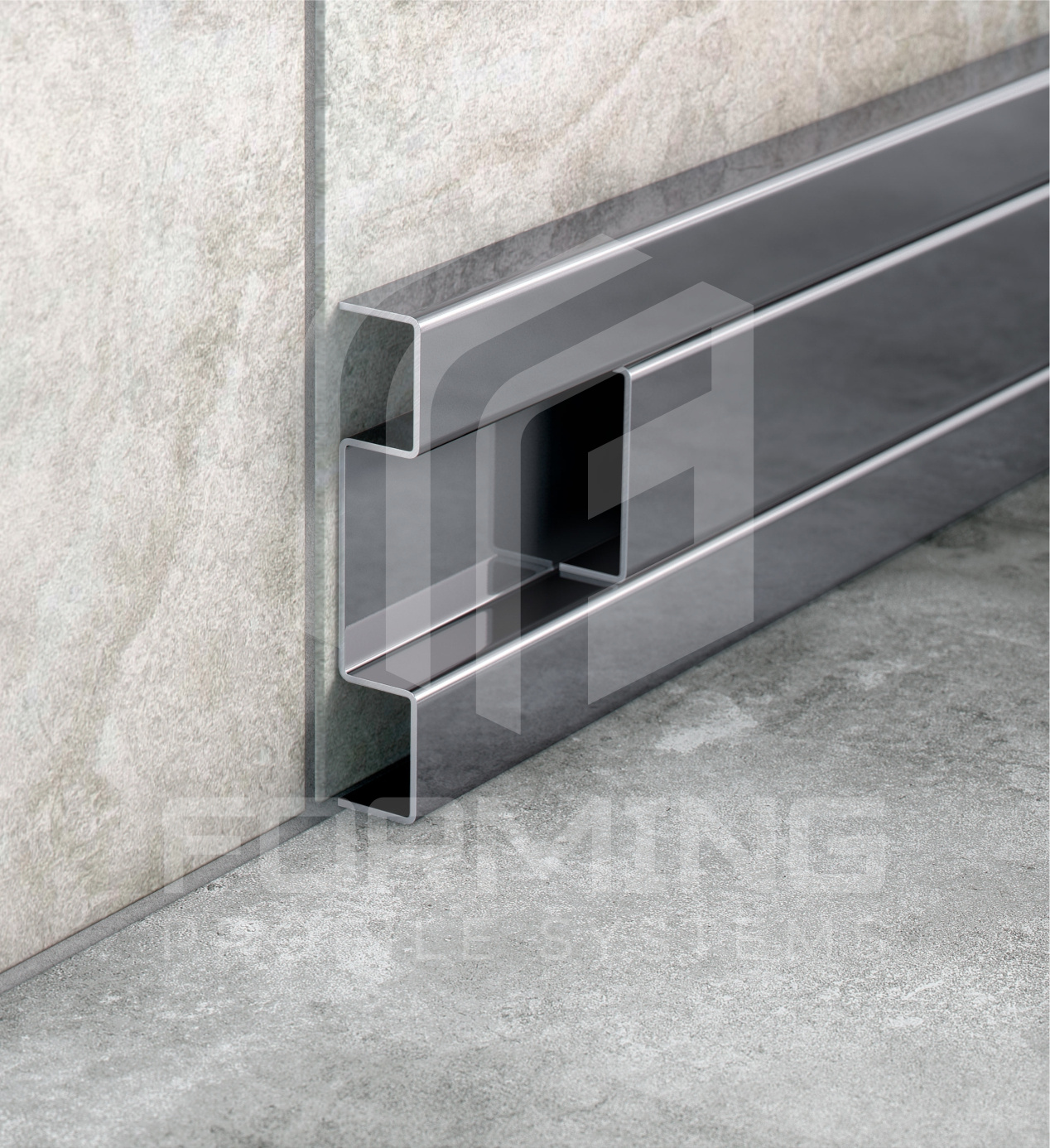 Составной декоративный профиль с возможностью установки подсветки из нержавеющей стали 0,8 мм в стандартном исполнении. Используется, как плинтус для придания завершенного вида помещениям отделанным плиткой, керамогранитом, стеновыми панелями и другими материалами.