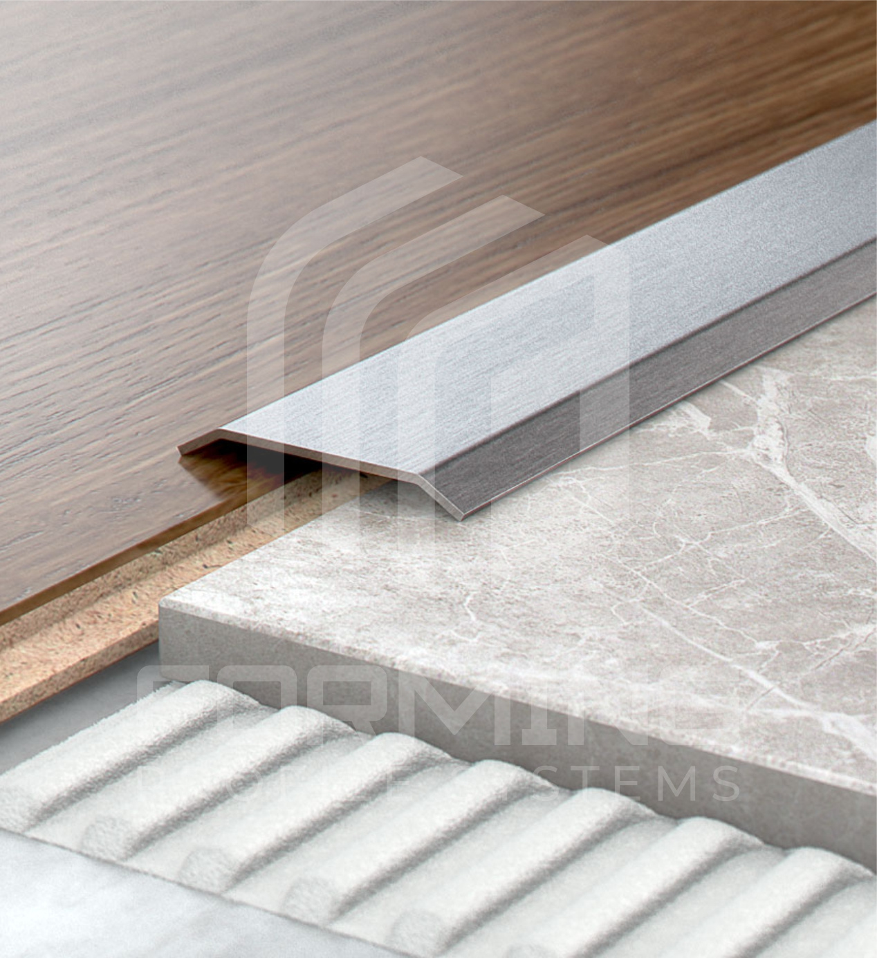 Плоский профиль-порог с ребрами жесткости из нержавеющей стали 1,5 мм в стандартном исполнении. Используется для перекрытия одноуровневых стыков напольного покрытия отделанного плиткой, керамогранитом, деревом и другими материалами.