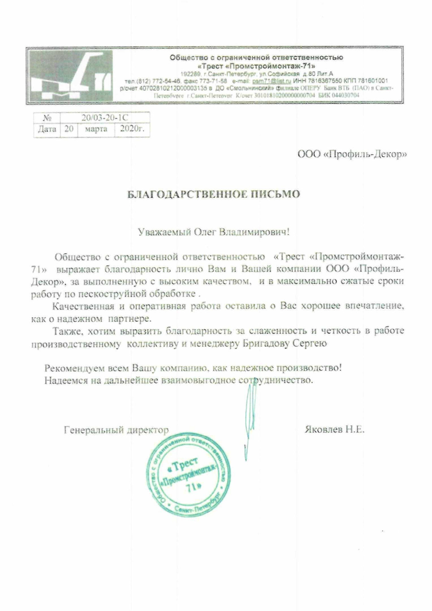 Общество с ограниченной ответственностью «Трест «Промстроймонтаж- 71» выражает благодарность лично Вам и Вашей компании ООО «Профиль- Декор», за выполненную с высоким качеством, и в максимально сжатые сроки работу по пескоструйной обработке.