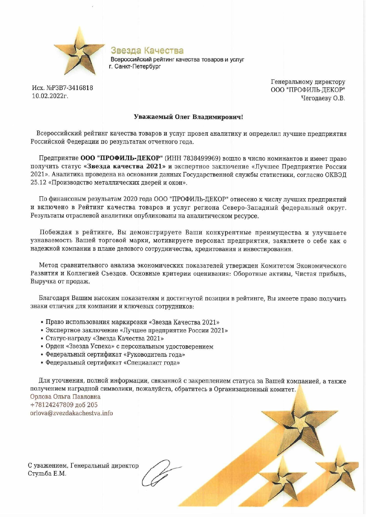 По финансовым разульатам 2020 года ООО "ПРОФИЛЬ-ДЕКОР" отнесено к числу лучших предприятий и включено в Рейтинг качества товаров и услуг региона Северо-Западный федеральный округ. Результаты отраслевой аналитики опубликованы на аналитическом ресурсе.