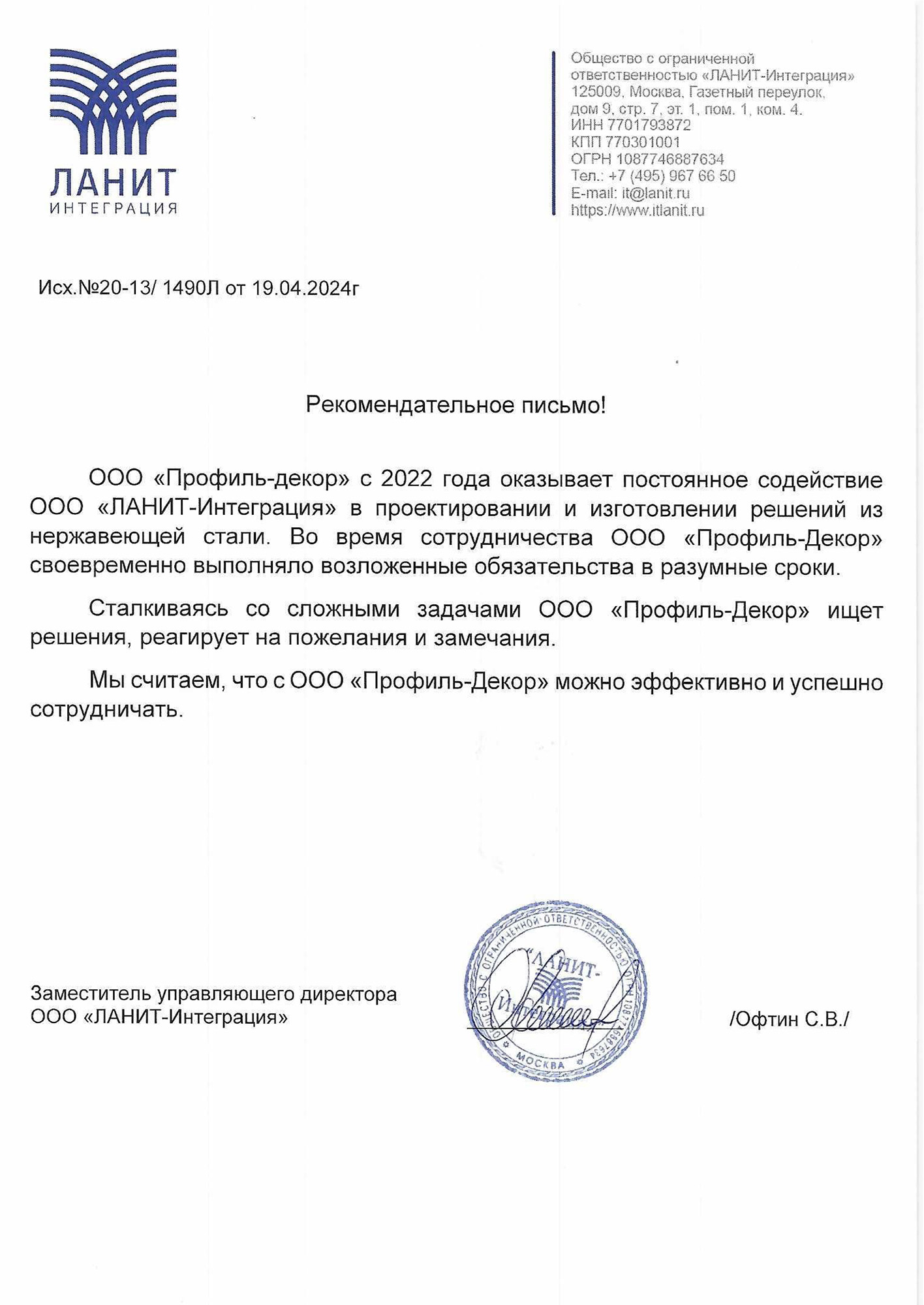 ООО «Профиль-декор» с 2022 года оказывает постоянное содействие ООО «ЛАНИТ-Интеграция» в проектировании и изготовлении решений из нержавеющей стали. Во время сотрудничества ООО «Профиль-Декор» своевременно выполняло возложенные обязательства в разумные сроки.