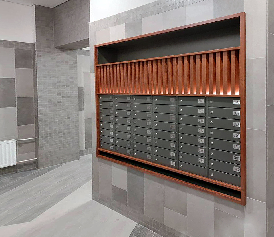 - Модульные конструкции для хранения вещей и приёма корреспонденции с гибкими вариантами компоновки под конкретные требования заказчика,
